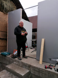 Det nye hus er bygget i sandwichplader som Nico havde fremskaffet. Mellem de 2 stålplader er der 100 mm hårdt skum. Fordelen er at det giver en simpel og stabil konstruktion og samtidig en super god isolering. Der skal ikke puttes mange små stykker træ på det nye komfur for at holde temperaturen oppe på et godt højt niveau.